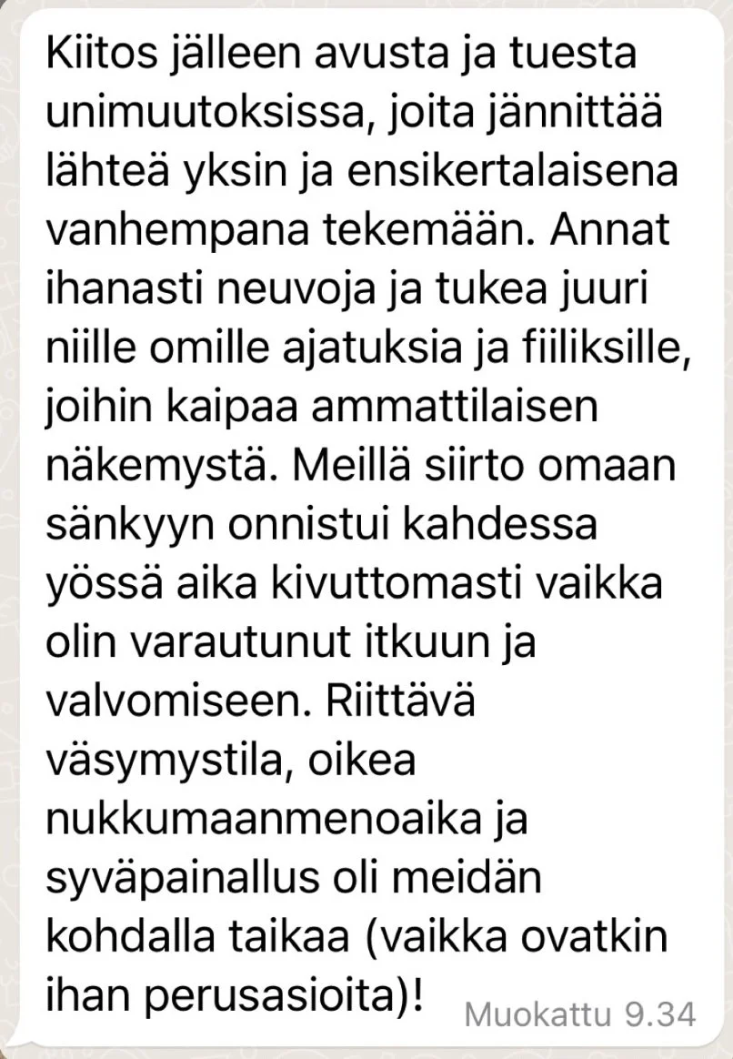Uniohjaus toteutetaan WhatsAppissa! Viestittely on mahdollista kirjoittamalla tai ääninviestein. Tässä matalan kynnyksen palvelussa on mahdollista paneutua yhteen tai pariin pieneen unihaasteeseen tai muutoksiin, jotka voivat liittyä esimerkiksi vauvan tai pienen lapsen yöheräilyihin, yövieroitukseen, aikaisiin aamuihin, päiväuniin, matkoihin, muutoksiin, rytmeihin tai nukkumaamenon haasteisiin. Palvelu sopii myös tilanteisiin, jossa kaipaat vahvistusta omille ajatuksille ja vastoille.